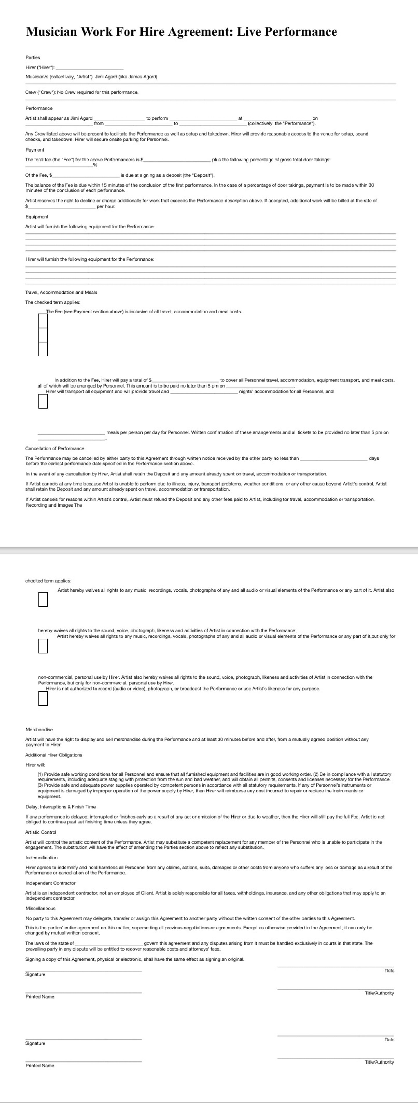 Musician For Hire Agreement